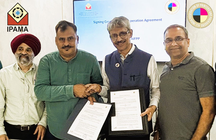 नवी दिल्ली : भारताच्या मुद्रण आणि पॅकेजिंग उद्योगाला नवीन दिशा देणाऱ्या एका ऐतिहासिक घडामोडीत इंडियन प्रिंटिंग, पॅकेजिंग अॅण्ड अलाइड मशिनरी मॅन्युफॅक्चरर्स असोसिएशन (आयपीएएमए) आणि ऑल इंडिया फेडरेशन ऑफ प्रिंटर्स अॅण्ड पॅकेजर्स (एआयएफपीपी) यांच्यात एक महत्त्वपूर्ण सामंजस्य करार (MoU) स्वाक्षरीत करण्यात आला. उत्तर प्रदेशच्या नोएडा येथील आयपीएएमए कार्यालयात सोमवारी १५ सप्टेंबर रोजी या सामंजस्य करारावर स्वाक्षऱ्या करण्यात आल्या. हा करार उद्योग क्षेत्रातील दोन अग्रगण्य संघटनांना एकत्र आणून नवकल्पना , सहकार्य आणि जागतिक पातळीवरील मान्यता यांमध्ये नवचैतन्य निर्माण करेल. सध्या देशभरात सुमारे २.५ लाख उद्योजक या क्षेत्राशी निगडित असून, हा करार त्यांच्या कार्यास नवसंजीवनी देणारा ठरेल. तसेच, आयपीएएमए आणि एआयएफपीपी यांना प्रदर्शन व उद्योगसंबंधी उपक्रमांसाठी विशेष धोरणात्मक भागीदार म्हणून मान्यता मिळेल.