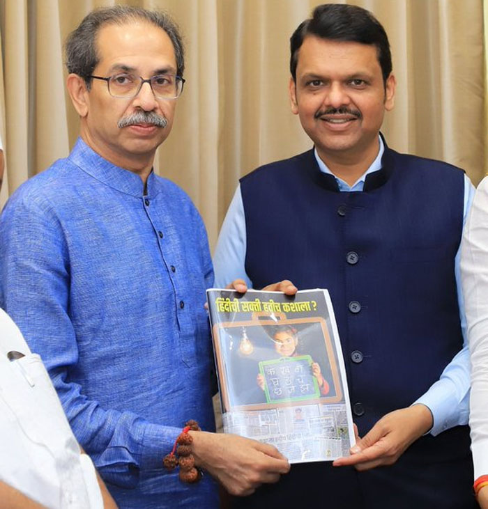 या भेटीत विधानसभा विरोधी पक्षनेते पद, त्रिभाषा सूत्र आणि हिंदी सक्ती संदर्भात ठाकरे व फडणवीस यांच्यात चर्चा झाल्याची माहिती आहे. हिंदीची सक्ती हवीच कशाला? हे पुस्तक ठाकरे यांनी फडणवीसांना दिले. तसेच, हेच पुस्तक नव्याने नेमण्यात आलेल्या समिती अध्यक्ष नरेंद्र जाधव यांना आपण द्यावे, असं फडणवीस यांनी ठाकरेंना म्हटले. तर, विधानसभा विरोधी पक्षनेतेपद हे विधानसभा अध्यक्षांचा अधिकार आहे. मात्र, हे विरोधी पक्षनेतेपद अजूनही दिलं जात नाही, त्या संदर्भाने उद्धव ठाकरे आणि आदित्य ठाकरे यांनी मुख्यमंत्री यांच्यासोबत अँटी चेंबरमध्ये चर्चा केल्याची माहिती आहे.