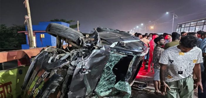अंबरनाथ : भरधाव कार चालविणाऱ्या चालकाने तीन दुचाकीस्वारांना अंबरनाथ पूर्व आणि पश्चिम भागाला जोडणाऱ्या पुलावर चिरडले. या अपघाताचा थरार सीसीटीव्हीत कैद झाला. हा अपघात एवढा भीषण होता की, एक दुचाकीस्वार थेट पुलाखाली जाऊन कोसळला. तर कारचाही पूर्ण चेंदामेंदा झाला. अपघातात चार जणांचा मृत्यू झाला असून दोन जण गंभीर जखमी असल्याची माहिती आहे. मिळालेल्या माहितीनुसार, भरधाव वेगातील कार चालकाचा वाहनावरील ताबा सुटल्यानंतर कारनं तीन दुचाकीस्वारांना चिरडलं. अपघातात सहभागी असलेल्या कारमध्ये शिवसेना (शिंदे गट) उमेदवार किरण चौबे देखील उपस्थित होत्या. चौबे यांच्या टाटा नेक्सन गाडीने चार ते पाच दुचाकींना जोरदार धडक दिली. कारचा चालक लक्ष्मण शिंदेला कार चालवत असताना त्यांना हृदयविकाराचा झटका आल्याने त्यांचं कारवरील नियंत्रण सुटल्याची प्राथमिक माहिती समोर आली आहे.
