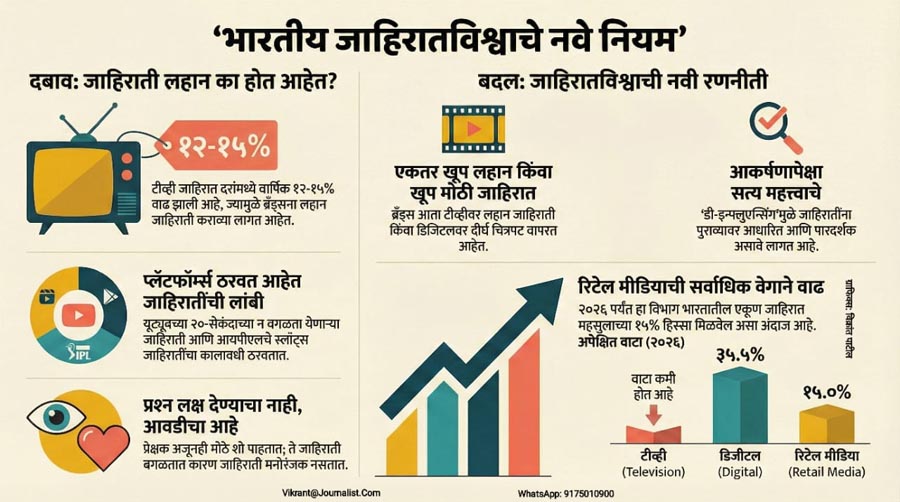 जाहिरातींच्या रणनीतीमध्ये एक मोठा बदल झाला आहे: आता सखोल कथाकथन टीव्हीवरून डिजिटल प्लॅटफॉर्मवर स्थलांतरित झाले आहे. टीव्हीवरील जाहिरात स्लॉट्स इतके महाग झाले आहेत की, ब्रँड्स आता टीव्हीचा वापर फक्त लहान, आठवण करून देणाऱ्या जाहिरातींसाठी करत आहेत – अगदी रस्त्यावरील बिलबोर्डसारखा. मनोज श्रॉफ यांच्या मते, सहा सेकंदांच्या जाहिरातीत फक्त एक लोगो आणि कृतीसाठी आवाहन दाखवता येते. याउलट, यूट्यूब आणि इंस्टाग्राम सारख्या डिजिटल प्लॅटफॉर्मवर खर्च कमी असतो आणि प्रेक्षकांना अधिक अचूकपणे लक्ष्य करता येते. सुमित हांडा यांच्या मते, यामुळेच लांबलचक आणि आशय-केंद्रित कथा आता या डिजिटल प्लॅटफॉर्मवर सरकत आहेत. ब्रँड्स त्यांच्या कथांना लहान भागांमध्ये विभागून सादर करत आहेत: क्रिकेट मॅचदरम्यान टीव्हीवर ६ सेकंदांचा बंपर दाखवला जातो, जो प्रेक्षकांना यूट्यूबवरील ९० सेकंदांच्या ब्रँड फिल्मकडे आकर्षित करतो. हांडा सांगतात की, “आम्ही आता 60 किंवा 90 सेकंदांच्या जाहिराती बनवू शकत नाही. आम्हाला १० किंवा १५ सेकंदांच्या फॉरमॅटमध्येच संवाद साधावा लागतो. आता खरे कथाकथनाचे कौशल्य हेच आहे की, तुम्ही तुमची कथा त्या लहान स्वरूपात कशी सांगता.” यामुळे टीव्हीवरील बजेट मोकळे होत असताना, ब्रँड्स ते पैसे कुठे गुंतवत आहेत? याचे उत्तर आश्चर्यकारक आहे.