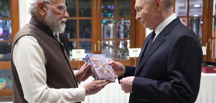 नवी दिल्ली : पंतप्रधान नरेंद्र मोदी यांनी रशियाचे राष्ट्राध्यक्ष व्लादिमीर पुतिन यांना रशियन भाषेत लिहिलेली भगवद्गीताची प्रति भेटवस्तू म्हणून दिली. दोन्ही नेत्यांच्या भेटीदरम्यान दिलेली हि भेटवस्तू भारत–रशिया संबंधांना आध्यात्मिक आणि सांस्कृतिक जोडणीचे नवे परिमाण देणारी ठरली आहे. पंतप्रधान मोदी म्हणाले की गीतेतील ज्ञान व संदेश जगभरातील कोट्यवधी लोकांना प्रेरणा देतात आणि तिची शिकवण प्रत्येक युगात मानवतेला योग्य दिशा दाखवत राहते.
