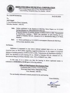 मुंबई : कंबला हिल येथील 33 KV Receiving Station व संबंधित सार्वजनिक सुविधांबाबत मांडण्यात आलेल्या प्रस्तावावर गंभीर आक्षेप नोंदवत आरटीआय कार्यकर्ते अनिल गलगली यांनी Brihanmumbai Municipal Corporation च्या डीपी (Development Plan) मुख्यालयात झालेल्या सार्वजनिक सुनावणीत उपस्थित राहून ठाम भूमिका मांडली. या सुनावणीत BEST चे वरिष्ठ अधिकारी देखील उपस्थित होते.