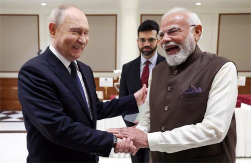 नवी दिल्ली : पंतप्रधान नरेंद्र मोदी यांनी शुक्रवारी रशियाचे राष्ट्राध्यक्ष व्लादिमीर पुतिन यांच्यासोबत हैदराबाद हाऊसमध्ये बैठक घेतली. २३ व्या भारत–रशिया शिखर परिषदेत सहभागी झाल्यानंतर दोन्ही देशांच्या नेत्यांनी संयुक्त पत्रकार परिषद घेतली. यावेळी राष्ट्राध्यक्ष पुतिन म्हणाले की, भारताच्या झपाट्याने वाढणाऱ्या अर्थव्यवस्थेसाठी रशिया सतत आणि अखंड इंधनपुरवठा करण्यास तयार आहे. संयुक्त पत्रकार परिषदेत बोलताना राष्ट्राध्यक्ष पुतिन म्हणाले, “राष्ट्रपती द्रौपदी मुर्मू, माझे प्रिय मित्र पंतप्रधान मोदी आणि भारताच्या जनतेचे, रशियन प्रतिनिधिमंडळाचे ज्या उत्साहाने स्वागत केले त्याबद्दल धन्यवाद.” त्यांनी पुढे सांगितले.