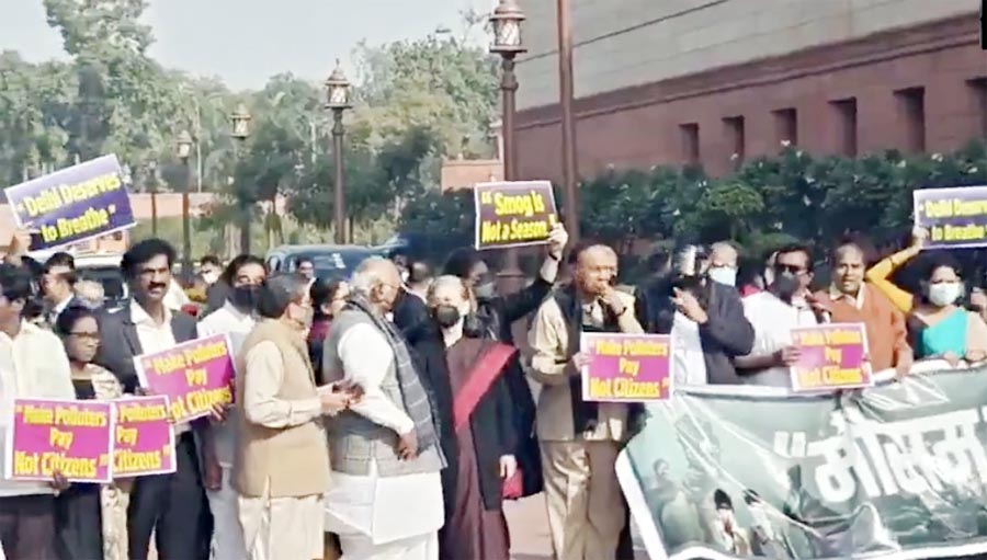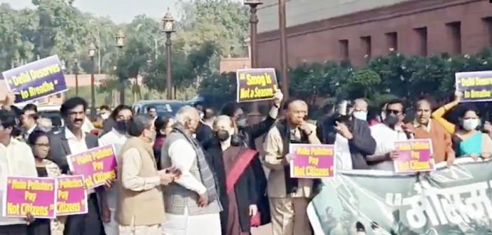 नवी दिल्ली : विरोधी पक्षांच्या नेत्यांनी गुरुवारी संसद भवन परिसरात राष्ट्रीय राजधानी क्षेत्रातील गंभीर हवामान-प्रदूषणाच्या समस्येविरोधात आंदोलन केले.या आंदोलनात सोनिया गांधी आणि काँग्रेस अध्यक्ष मल्लिकार्जुन खरगेही उपस्थित होते. यावेळी शहरातील वायु-प्रदूषणावर नियंत्रण मिळवण्यासाठी सरकारने तात्काळ कारवाई करावी, अशी मागणी सोनिया गांधी यांनी केली. अनेक विरोधी पक्षांच्या नेत्यांनी संसद भवनाच्या मकर द्वाराबाहेर हातात फलक घेऊन घोषणाबाजी केली आणि पंतप्रधानांनी केवळ निवेदने देणे थांबवून प्रत्यक्ष कृती करावी, अशी मागणी केली. वायु-प्रदूषणाची भीषणता दाखवण्यासाठी काही खासदारांनी प्रतीकात्मकरीत्या मास्कही घातले होते.
